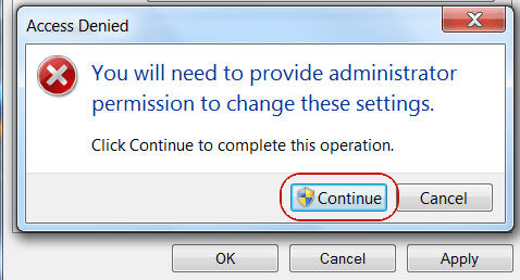 - Clicking Apply button Windows may require Administrator’s privileges to make changes. Press “Continue” and it would accept changes. Click ok to close Properties dialog box.