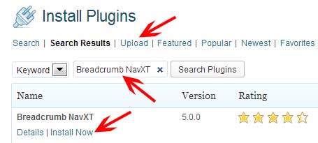 Go to your website’s plugin install page. For example, http://yourwebsite.com/wp-admin/plugin-install.php, where yourwebsite.com should be replaced by your website address. Paste “Breadcrumb NavXT” (without quotes) in the Search input field and click “Search Plugins” button. Once results are loaded with the desired plugin (see image below) on the top, click the Install now link and plugin should be installed automatically. Once installed activate the plugin.